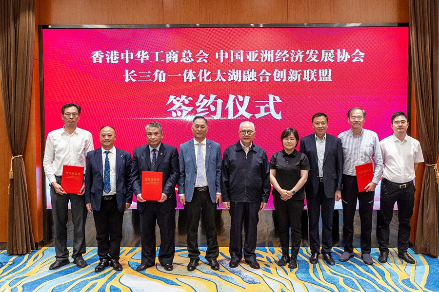 座谈会后,香港中华工商总会、中国亚洲经济发展协会、长三角一体化太湖融合创新联盟以“相互借鉴、优势互补、实现共赢、共同发展”为宗旨举行三方战略合作协议签约仪式,携手推动三方在更广领域、更深层次、更高水平实现交流合作,打造更具创新理念和服务体系的共赢模式。