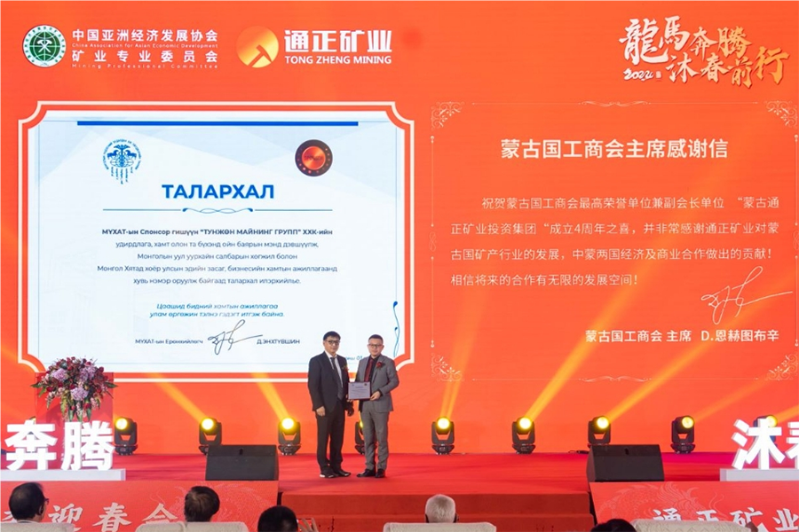 历添新岁,春满山河。2024年1月22日,中国亚洲经济发展协会矿业专业委员会新年迎春会暨通正矿业成立四周年庆典在常州举办。到会嘉宾有:蒙古国前议长土木尔奥奇尔、第九届全国工商联副主席程路,中国亚洲经济发展协会会长权顺基、执行会长刘红路,前蒙古国矿业部部长,蒙古国国家工业化委员会主任,科技科学博士巴德玛苏仁、中国科学院院士杨经绥、蒙古国煤炭协会会长左乐吉尔格拉、蒙古国驻中国大使馆商务参赞图门巴亚尔、俄罗斯科学院与工程院外籍院士肖克炎、中国煤炭科工集团首席科学家,享受国务院特殊津贴鞠文君、蒙古国工商会对外联络部部长阿木尔巴亚尔、曹妃甸港口商务经济区主任周立军。国务院参事,国土资源部原总工程师张洪涛、中国煤炭地质总局副书记兼副局长任辉、国家开发银行信贷管理局局长,中国开发性金融促进会会长袁英华、蒙古国工商会会长图杜仁、中国报关协会秘书长张鹏发来祝贺视频。亚矿委会员单位代表、通正矿业合作伙伴代表800余人欢聚一堂,辞旧迎新、共话未来。迎春会由中国亚洲经济发展协会执行会长刘红路主持。